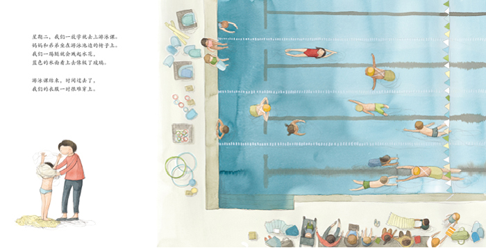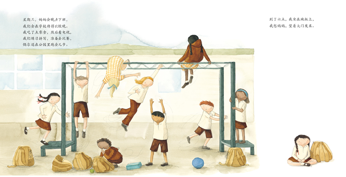 星期一,我们匆匆吃完早餐。星期二,我们一放学就去上游泳课。星期三,妈妈会晚点儿下班,我们在学校待得比较晚。星期四,我们参加管弦乐队训练,我拉小提琴,弟弟打鼓。星期五,我们在学校有体育课,还要和妈妈去购物。每个星期六有投球比赛,我打篮球,弟弟踢足球。到了星期天,时间慢了下来,我们没有任何安排,不用出门,不必坐车,我们可以整天穿着睡衣,静静地做自己想做的事情:种下一颗种子、做一只风筝、看一场演出,或者在最喜欢的树上荡秋千。