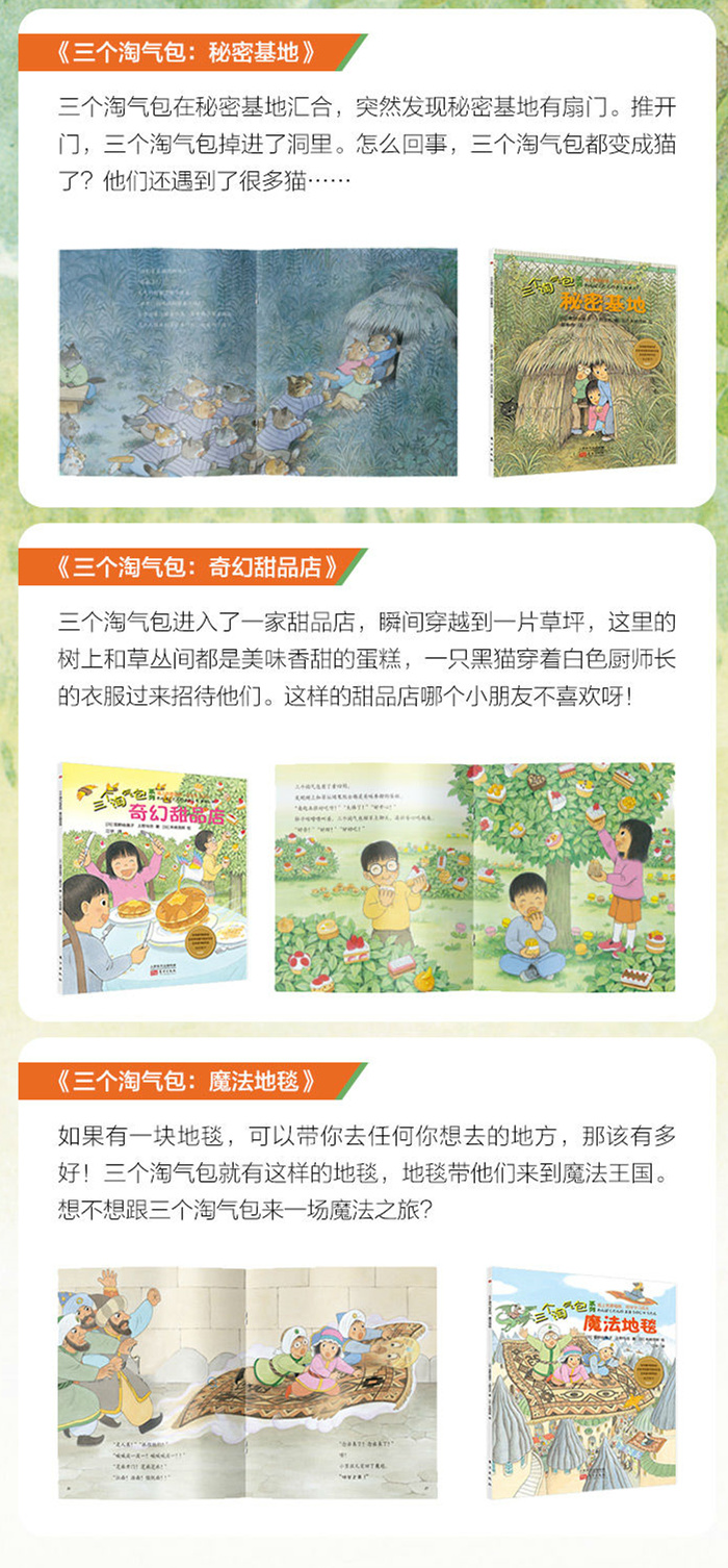 童年是天真烂漫的,是快乐的。总是三三两两的让人头疼的淘气包聚集在一起,玩游戏,过家家,玩探险。本套书就是一套关于淘气包的故事,此套书图画温馨,从三个小主人公的游戏为切入点,讲述三个主人公的充满未知与欢乐的经历,带领着读者们进入畅想的空间,体会另一番感受。全套现共20册。