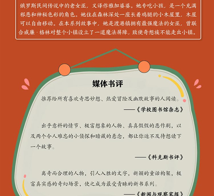 屡获大奖,国外媒体好评如潮 连续13周蝉联美国《纽约时报》畅销图书榜 美国《科克斯评论》年度奇幻小说 奥本海姆玩具展白金奖 美国纽约公共图书馆“可供阅读和分享的100部书” 美国《华盛顿邮报》十大暑期读物之一 美国独立书商协会选书 《今日美国》畅销书 被美国*受女性欢迎的杂志之一《简单生活》列为书目