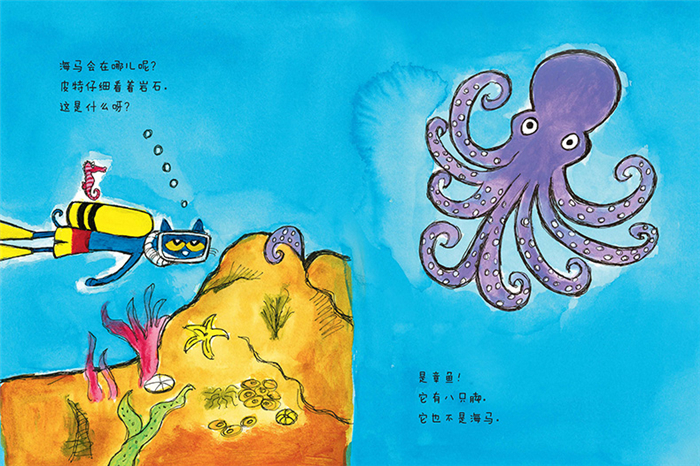 《皮特猫:海底世界真神奇!》:皮特猫戴上潜水面镜,穿上脚蹼,背上氧气瓶,然后潜到海里去探险。皮特看到剑鱼、章鱼、水母……还找到了海马!他说:“海底世界真神奇!”