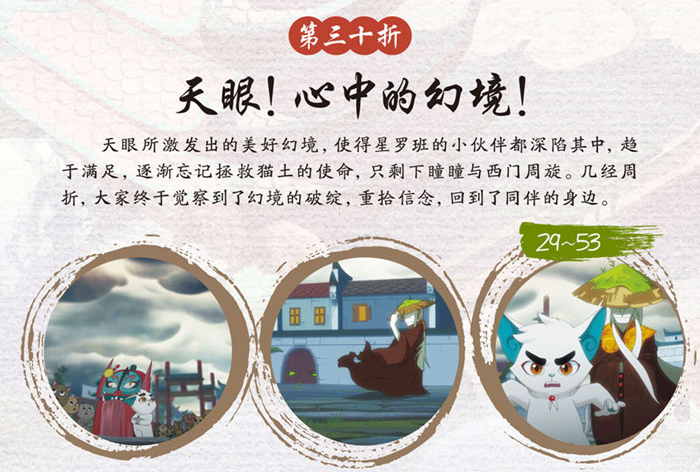 第三十折 天眼!心中的幻境!天眼所激发出的美好幻境,使得星罗班的小伙伴都深陷其中,趋于满足,逐渐忘记拯救猫土的使命,只剩下瞳瞳与西门周旋。几经周折,大家终于觉察到了幻境的破绽,重拾信念,回到了同伴的身边。