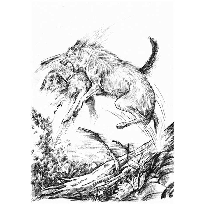 难道就这样乖乖地被老雕吃掉了吗?假如此刻被老雕攫在铁爪下的是一只食草类动物,早就在被凌空攫起的一瞬间吓破胆,气绝身亡了;假如此刻被老雕攫在铁爪下的是普通的食肉类动物,如狐狸、红豺或狗獾什么的,恐怕也早就丧失了反抗意识。但此刻被老雕攫在铁爪下的是狼,狼是草原的精英,是野性的化身,更何况是匹饱经磨难在险恶大自然里已铸炼成钢铁意志的老狼。因此,尽管已身陷绝境,紫岚并未丧失反抗意识。在狼的生存词典里,是没有束手待毙这一说的;狼习惯于反抗到流尽最后一滴血。难道就这样乖乖地让老雕来吃掉自己吗?紫岚想。不,无论如何,它死也要捞回一把的。当然,现在它被吊在高空,无法施展扑咬撕抓的狼的本领,但老雕不可能永远把它悬吊在空中的。老雕正在把它带回雕巢去。有了!只要一飞到老雕的巢穴,它的四肢一沾着大地——这完全可能的,老雕在自己的巢穴前一定会先把它扔在地上,啄瞎它的眼睛,啄破它的脑壳,啄穿它的肚肠——也就是说,它还有最后一次机会,在咽气前向可恶的老雕发出最后的致命的一击。