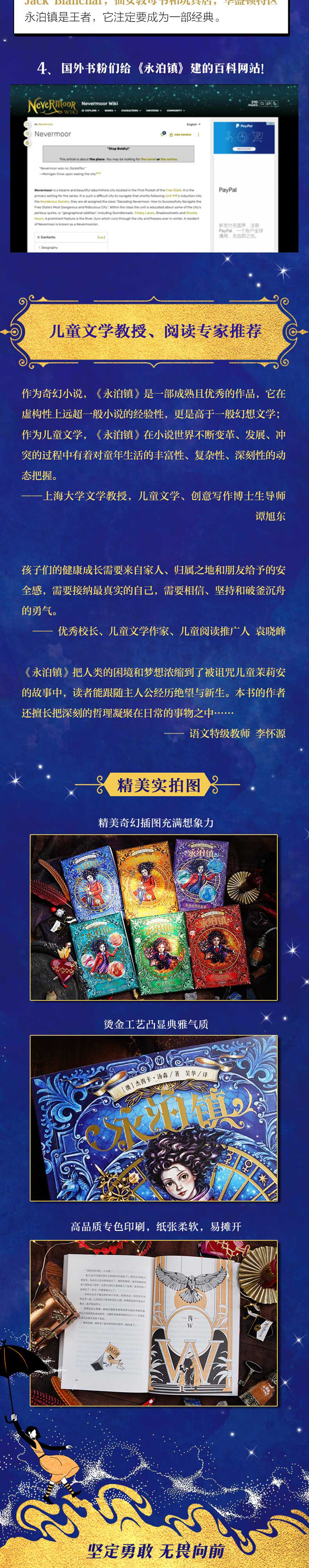 1、售出30多国版权的少儿奇幻文学,20世纪福克斯买下电影版权 蝉联《纽约时报》畅销书榜4周,版权售出到30多个国家及地区。荣获2017年亚马逊年度童书、2018年水石书店童书奖、澳大利亚书业奖等。《泰晤士报》《柯克斯评论》《卫报》《时代周刊》大力推荐。 2、宏大世界观设定+超群想象力,带来全新震撼的魔法世界 阑夜期、奇迹社团、丢卡利翁大饭店、心法……新鲜有趣的宏大魔法世界,让人即可入坑。 故事情节引人入胜,人物角色亲切、充满魅力,对话机智、幽默。 3、相信自己、无畏向前的精神,为成长中的孩子奠定积极价值观 孩子们随着主人公一起经历成长和蜕变:从否认自我,到认识自己、相信自己,后接纳自己,不被外界定义而是遵从自己内心选择成为怎样的人。理解并学会爱与被爱、友情、勇敢、善良、正义、诚信等等成长阶段应该拥有的美好品质。 4、多元而深刻的小说主题,为孩子提供一面镜子认识真实世界 在奇幻的外表下,《永泊镇》有着现实主义文学般复杂、深刻的主题。无论是竞争激烈的奇迹选拔赛,还是看似理想世界中存在的分歧与问题,都能成为孩子了解真实世界的一面镜子。 5、原作与译文质量双优,值得儿童阅读的扎实与高品质文本。 本书译者经验丰富,用心打磨语言、节奏,文词生动、丰富、优美,具有文学性。