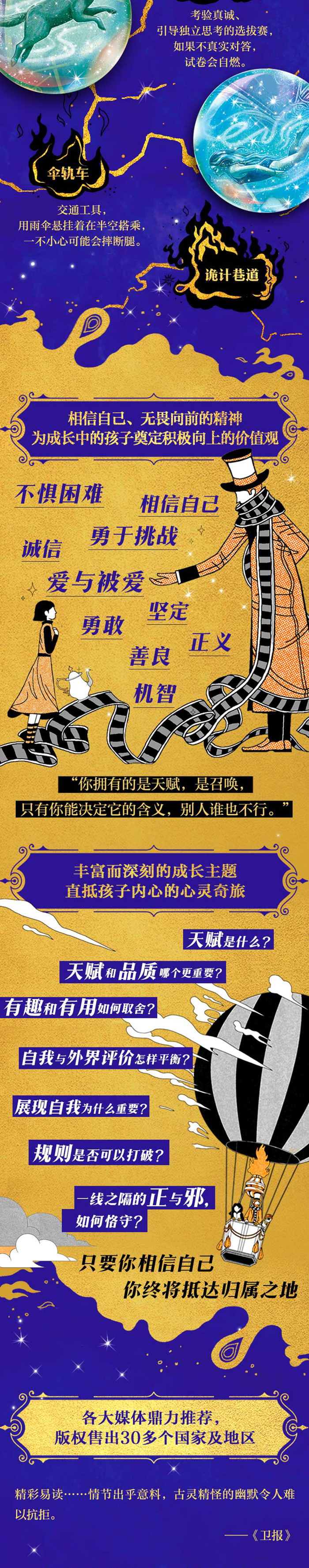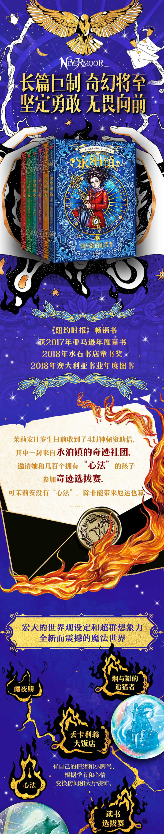 1、售出30多国版权的少儿奇幻文学,20世纪福克斯买下电影版权 蝉联《纽约时报》畅销书榜4周,版权售出到30多个国家及地区。荣获2017年亚马逊年度童书、2018年水石书店童书奖、澳大利亚书业奖等。《泰晤士报》《柯克斯评论》《卫报》《时代周刊》大力推荐。 2、宏大世界观设定+超群想象力,带来全新震撼的魔法世界 阑夜期、奇迹社团、丢卡利翁大饭店、心法……新鲜有趣的宏大魔法世界,让人即可入坑。 故事情节引人入胜,人物角色亲切、充满魅力,对话机智、幽默。 3、相信自己、无畏向前的精神,为成长中的孩子奠定积极价值观 孩子们随着主人公一起经历成长和蜕变:从否认自我,到认识自己、相信自己,后接纳自己,不被外界定义而是遵从自己内心选择成为怎样的人。理解并学会爱与被爱、友情、勇敢、善良、正义、诚信等等成长阶段应该拥有的美好品质。 4、多元而深刻的小说主题,为孩子提供一面镜子认识真实世界 在奇幻的外表下,《永泊镇》有着现实主义文学般复杂、深刻的主题。无论是竞争激烈的奇迹选拔赛,还是看似理想世界中存在的分歧与问题,都能成为孩子了解真实世界的一面镜子。 5、原作与译文质量双优,值得儿童阅读的扎实与高品质文本。 本书译者经验丰富,用心打磨语言、节奏,文词生动、丰富、优美,具有文学性。