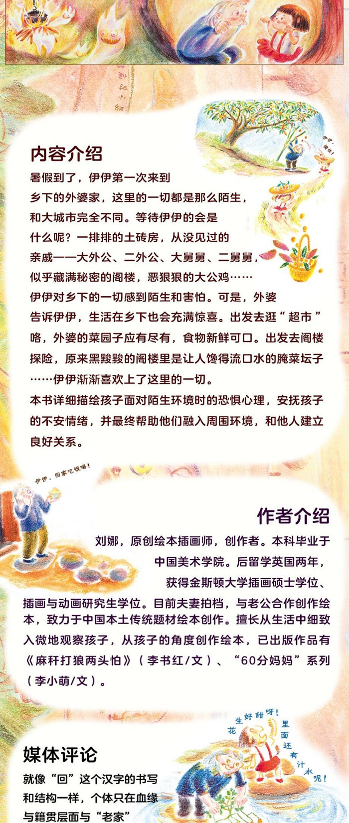 暑假到了,伊伊第一次来到乡下的外婆家,这里的一切都是那么陌生,和大城市完全不同。等待伊伊的会是什么呢?一排排的土砖房,从没见过的亲戚——大外公、二外公、大舅舅、二舅舅,似乎藏满秘密的阁楼,恶狠狠的大公鸡……伊伊对乡下的一切感到陌生和害怕。可是,外婆告诉伊伊,生活在乡下也会充满惊喜。出发去逛“超市”咯,外婆的菜园子应有尽有,食物新鲜可口。出发去阁楼探险,原来黑黢黢的阁楼里是让人馋得流口水的腌菜坛子……伊伊渐渐喜欢上了这里的一切。