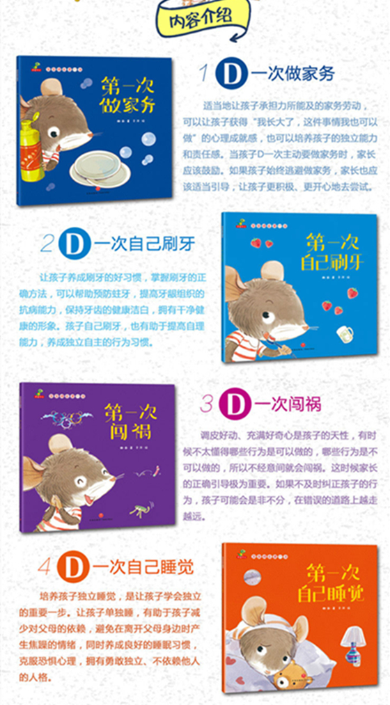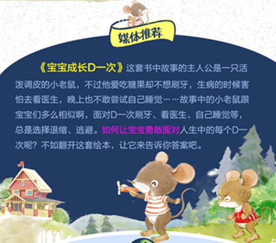 宝宝的每个D一次,都是很重要的成长瞬间。当宝宝能独立完成D一次刷牙、D一次睡觉,说明宝宝的生活自理能力又得到了提高;当宝宝D一次自己克服困难、承认自己的错误;说明宝宝变得更勇敢、有担当……宝宝自己成功地完成一件事情时,一定也会收获满满的成就感。所以我们推荐这套《宝宝成长D一次》,希望每个宝宝都能勇敢面对、积极尝试人生中必经的各种D一次。