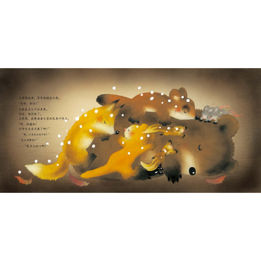 下雪了,该冬眠了,可是大熊怎么都睡不着。一会儿,有人偷偷走近大熊,大熊假装睡着了。听声音,来的是很小的动物,还不止一只呢。渐渐的,小老鼠、松鼠、果子狸、小兔子……大家陆陆续续都赶来了。原来,寒冷的冬天里,小动物们把大熊当成被窝了。突然,小动物们担忧起来:年年来找大熊当被窝,大熊一定会生气。可是大熊却想,原来整个冬天不是我一个人孤单单地睡在这里,有大家陪着我呢!