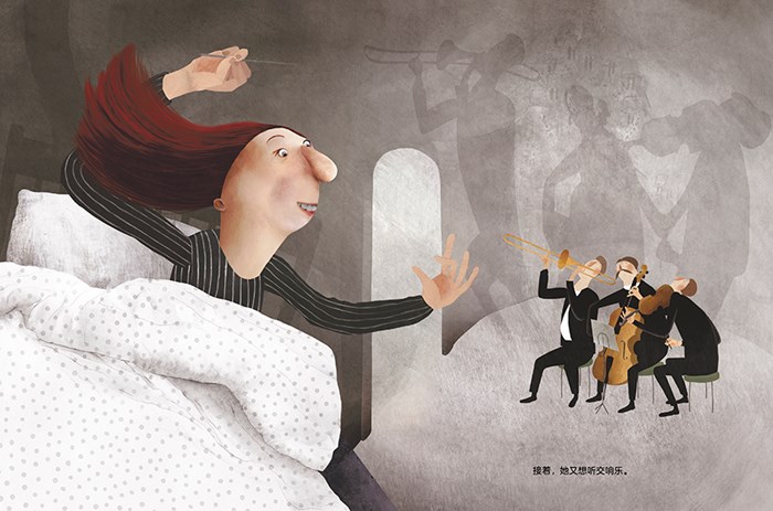 已经上床睡觉的女儿,被妈妈的呼唤声吵醒:可以倒一杯水给我喝吗?可以读会儿书给我听吗?我想你哄我睡。我的脚也想要垫高高,你给我做一个垫子嘛……她一次又一次地满足着妈妈的一个又一个要求,把钢琴、大提琴手、小提琴手、长号手、小丑、空中飞人、魔术师、马戏表演者、老虎、大象……统统都请进了妈妈的卧室。