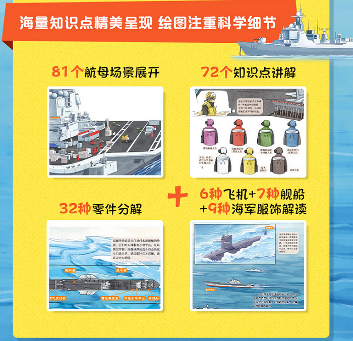 *以故事串联的航母科学知识绘本,知识融入图画故事,科学不无聊。 *权威科普作者创作、两大院士 专业大咖专家审订推荐。 *一套3册的设计,进阶的故事线引人入胜。 *故事 知识拓展 标签的文字形式、符合亲子共读需求。 *注重情节内在逻辑和科学细节的绘画。 81个航母场景展开 72个知识点讲解 32种零件分解 6种飞机 7种舰船 9种海军服饰解读