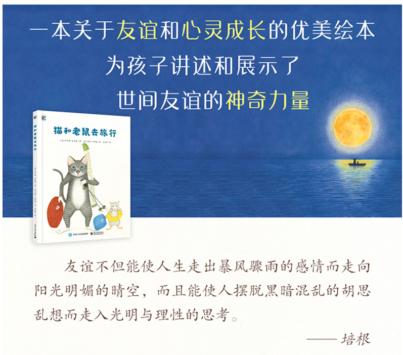 《猫和老鼠去旅行》一本关于友谊与心灵成长的优美绘本,画风清新纯真,色彩干净柔和。虎斑猫和小老鼠简单又不平凡的旅行,不仅让孩子体会到友谊的真谛,也收获了内心的富足和宁静。