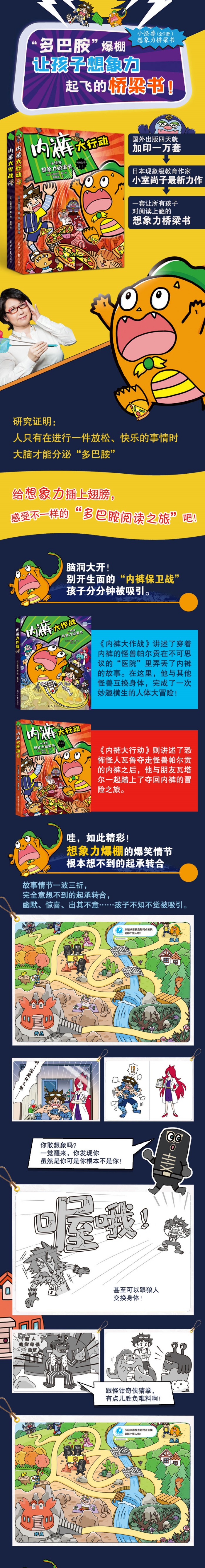 脑洞大开!别开生面的“内裤保卫战”,孩子分分钟被故事吸引。 小怪兽帕尔贡和同伴瓦塔尔在妖怪病院的冒险、在算术王国的算术大战。在寻找内裤的过程中,认识了苗条医生、肾脏博士、吱吱伯爵和瓦鲁国王等角色。惊险刺激的冒险故事、寻找内裤的新颖题材、新奇古怪的人物设定等,充分满足孩子的好奇心理。 想象力爆棚,令人喷饭的爆笑情节,激发孩子的阅读欲。 和吸血鬼交换牙齿、和狼人交换身体,甚至还可以和怪钳奇侠比赛猜拳,无论从故事情节到人物设置都相当精彩,让孩子拿起放不下,为孩子带来富有想象力的阅读体验。 充满想象力的认知体验,情境中融入知识,带入问题思考,学得更扎实! 充满童趣的画风和语言,减少文字阅读的枯燥无趣,带来满满的新鲜感。不拘泥于简单的科普知识陈述,把数学、人体知识都融入了故事情景中,自然、生动有趣地引导,让孩子学着去解题、去思考。这上面的数学可是小学生数学课本上的重难点哦! “国外出版四天就加印一万套”的日本现象级教育作家小室尚子最新力作!一套让所有孩子对阅读上瘾的想象力桥梁书! 日本亲子学会理事小室尚子的全新力作,一经出版就成为日本媒体热议话题,“孩子能一边玩一边快乐地学习了”。送给孩子一个完全属于自己的世界。 充满想象力的66个智力游戏,从多巴胺到内啡肽,符合大脑奖励机制,持续激发孩子的阅读成就感。 书中把各种知识点设计成了迷宫、找错、问答等有趣的故事和游戏,让孩子边玩边学,在游戏中培养孩子获取知识的兴趣,培养孩子的想象力、思辨力和判断力。