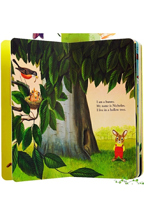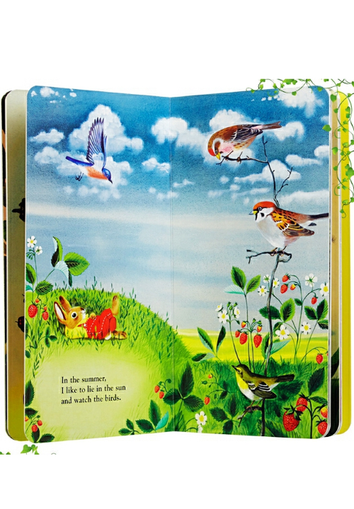 这是斯凯瑞创作的金色童书之一。这本撕不烂的卡板书,即使小朋友很小也不怕撕坏,1岁就可以阅读了。色彩丰富柔和,制作精美,创意十足;可爱的小兔子尼古拉斯一年四季的生活贯穿了整个故事始终。绚丽的画面将春夏秋冬的特色呈现得淋漓尽致,有助于孩子理解大自然的变化。简单的英语,非常适合刚开始接触英语的宝宝。书的画面非常精美,色彩绚丽,通过小兔子的眼展现了四季更迭中绚烂的美景:春天的鲜花盛开,蝴蝶飞舞,夏天雨打池塘,秋天落叶飞舞,动物们忙收藏,冬天漫天白雪。书本还展现了小兔子在大自然的怀抱中怡然自得的可爱样子:与蝴蝶嬉戏、与落叶共舞、摘花、躲雨,尤其是双手放在膝盖上站在蘑菇下面躲雨的样子,既显示了保护自己的本能,又展现了可爱的一面。