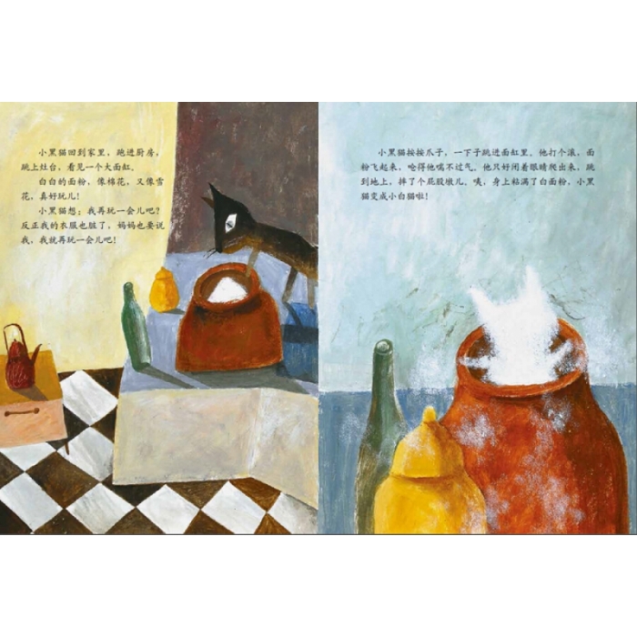 小花猫,真漂亮:圆圆的眼睛,长长的尾巴,胡子一翘一翘的,耳朵一动一动的,一身带黄花的白绒毛。可是,他一会儿跳进油漆桶,一会儿滚过黄泥巴,一会儿钻过旧烟筒,一会儿掉进面粉缸,最后他会变成什么样子呀?你们好奇吗?