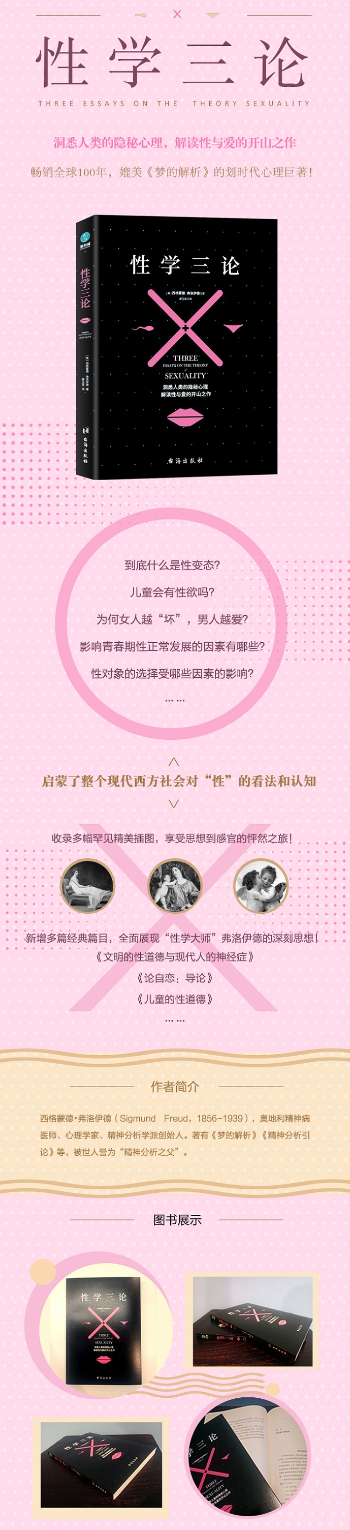 《性学三论》作为一本写给成人的性启蒙书,解答了我们对于性的所有困惑。本书堪称与《梦的解析》并驾齐驱的心理学著作,是揭示人类性心理隐秘的传世之作,集结了弗洛伊德生平性学理论中所有令人瞩目的篇章,大部分版本中未收入《文明的性道德与现代人的神经症》《论自恋:导论》《儿童的性道德》等也被收入本书。《性学三论》译文经过译者反复梳理打磨,以争取能更贴近读者,帮你确定无疑地读懂为止。