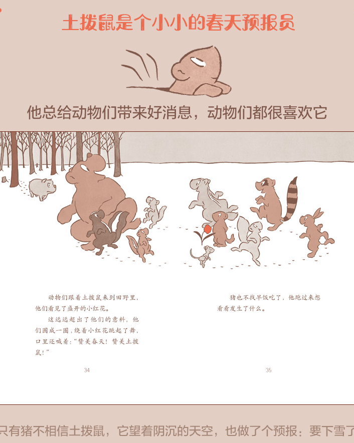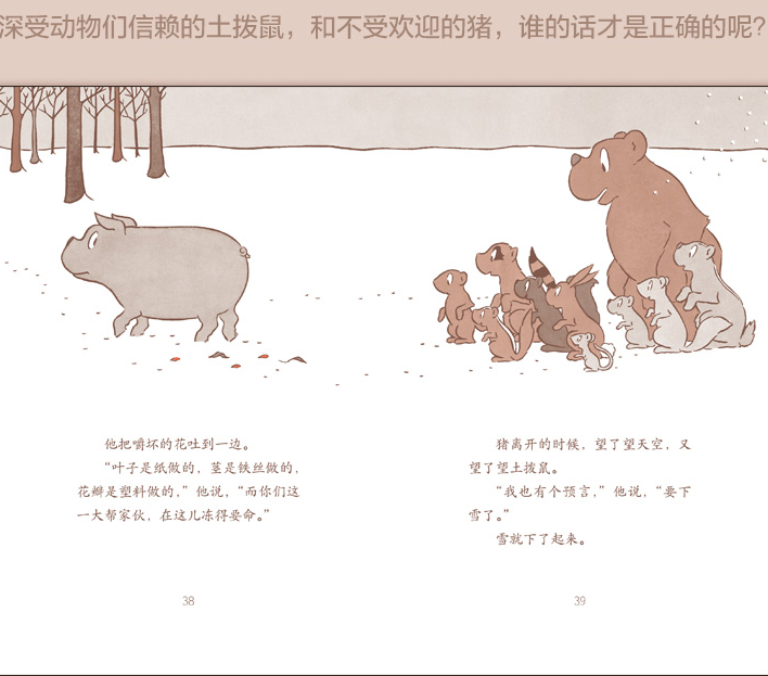 土拨鼠是个小小的春天预言家,动物们都喜欢听它的预言,因为它总会带来好消息:春天就要来了。可猪不相信土拨鼠的话,它望着阴沉的天空,也做了个预言:要下雪了!天就下起了大雪。正在庆祝春天到来的动物们,冻得直发抖。它们气坏了,决心要好好算算这笔账。你猜,它们会找谁算账呢?