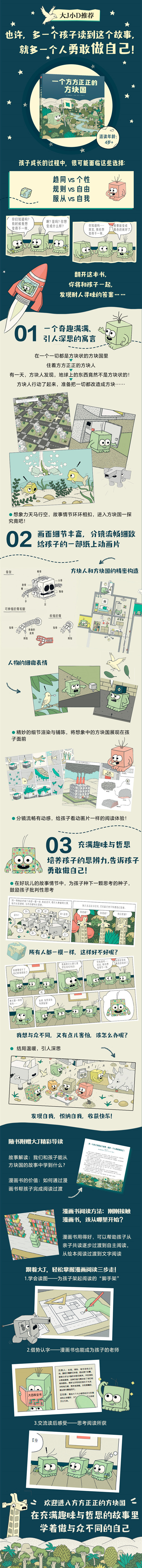 1. 充满哲思,培养孩子的自我意识和思辨力。这本绘本中的很多故事情节,有着较强的寓意,为孩子种下一颗思考的种子,鼓励孩子批判性思考,告诉孩子坚持自我,敢于打破常规。 2. 绘画风格清新可爱,细节精致。城市的精密构造、动物和人物的细微表情,都得到了巧妙的刻画,用图画将想象中的方块国展现给孩子 3. 人物充满吸引力,故事情节引人入胜,想象力天马行空,能吸引孩子注意力;分镜流畅细致,给孩子看动画片一般的阅读体验。 4. 结局温暖,引人思考,告诉孩子坚持自我,才能收获内心的快乐。 5. 随书附赠大J精彩导读,包括故事解读、漫画书的价值分析,漫画书的阅读方法放送