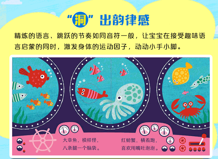 “洞洞里面藏着谁?”共四册,包括《哇!火箭》《呀!直升机》《噢!潜水艇》《嘿!拖拉机》。这是一套极富创意的洞洞纸板书,书中介绍了四种交通工具。鲜艳的色彩、可爱的人物形象以及朗朗上口的文字都能给0~3岁的孩子带来全新的阅读体验。书中每一页都有精心设计的圆形模切孔,能够带着孩子探索太空、海底、农场、参与营救,在翻页过程中,孩子们能够感受到洞洞在页面转换中的神奇效果,每个洞洞后面都隐藏着惊喜。洞洞里藏着什么,让我们一起来探索吧!1.圆角设计,不伤宝宝双手;2.三层厚白卡对裱,不怕宝宝撕咬;3.书中的洞洞设计巧妙,引导孩子探索故事;吸引宝宝动动小手,帮助0~3岁宝宝发展精细动作;4.韵律文字郎朗上口,符合0~3岁宝宝听读习惯。