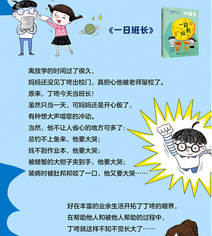 “蹦蹦跳跳上学去”系列围绕一年级的小男孩丁咚展开。他活泼又可爱、纯真又调皮,那颗顶着一副大眼镜的小脑袋瓜儿里,装的尽是古灵精怪的奇思妙想。次默写、次举办生日派对、次帮妈妈洗衣服、次忍住不哭……丁咚的很多“次”充满了灵动、幽默、温馨的情调,小读者在故事中都可以发现自己成长的点滴。 儿童文学作家张菱儿,用清浅轻松的语言截取小主人公丁咚生活中一个个鲜活的片段,描写他和伙伴们的童稚和善良、成长和欢闹、梦想和失落……童趣盎然的情节,独一无二的成长体验,唤醒孩子们的自信,让他们学会沟通与理解,享受爱,体验成长。