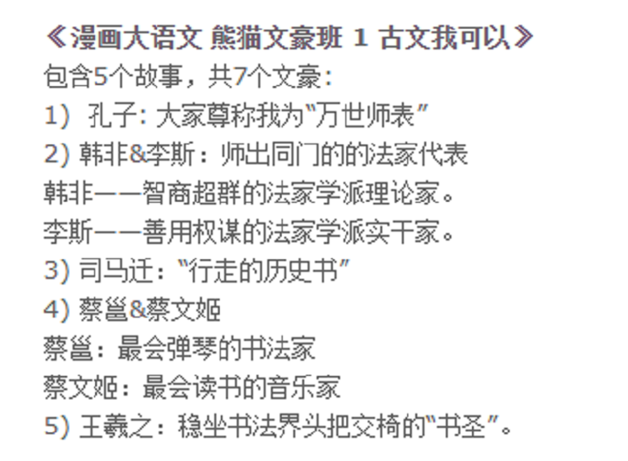本书为熊猫文豪班系列漫画册,将有七位熊猫文豪班干部和大家见面:成熟稳重的班长孔子,创立儒学,影响了华夏后世几千年的思想。执着热忱的副班长韩非,带大家学习法家经典;深沉老练的政治课代表李斯。坚毅隐忍的历史课代表司马迁,让大家知道如何在困境中坚持不懈,写出《史记》。耿直敢言的书法课代表蔡邕,和才高气傲的音乐课代表蔡文姬是一对才熊父女。而豪爽洒脱的宣传委员王羲之,带你看看《兰亭集序》中的生花妙笔。