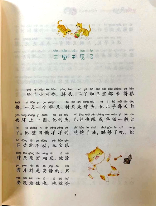 sanbǎo-bu jiànile 三宝不见了 chú le xiǎo kě lián pàng tóu èr yā hé sān bǎo dōu zhǎng de hěn 除了小可怜,胖头、二丫和三宝都长得很 kuài yì tiān yí gè yàngr tè bié shì pàng tóu tā jī hū měi tiān dōu 快,一天一个样儿。特别是胖头,他几乎每天都 yào pàng shang yì quān tā de tóu yǐ jing kuài gēn chéng nián māo yì bān dò 要胖上一圈。他的头,已经快跟成年猫一般大 18 tà zhěng rì lǎn yáng yáng de chi bǎo le shuì shuì gòu le chī néng 了。他整日懒洋洋的,吃饱了睡,睡够了吃,能 bú dòng jiù bú dòng 不动就不动。