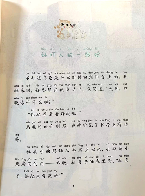 hǎo xià rén de yì zháng liǎn 好吓人的一张脸 bù zhī dao wū gui shì shén me shi hou huí dào yáng tái shang de 不知道乌龟是什么时候回到阳台上的。我 xing lai shítā yǐ jing zài wǒ shēn biān le wǒ wèn dào dà shī zuó 醒来时,他已经在我身边了。我问道:“大师,昨 wǎn nǐ gàn shén me la晚你干什么啦?” nǐ jiù děng zhe kàn hǎo xi ba“你就等着看好戏吧!” wū guī de huà yīn gāng luò wǒ jiù ting jiàn le shū fáng l yǒu dòng 乌龟的话音刚落,我就听见了书房里有动 jing静。 dù zhen zǐ de mā ma cóng shü fáng li chü lai qù qiāo mǎ xiǎo 杜真子的妈妈从书房里出来,去敲马小 tiào fáng jiān de mén zuó wăn dù zhēn zǐ shui zài li miàn dủ zhēn 跳房间的门--昨晚,杜真子睡在里面:“杜真 zi kuài qī lai bèi ying yǔ子,快起来背英语!”