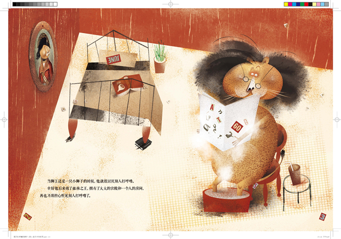 作者们用画面与文字传递出了十分幽默的情绪,通过富于设计感的构图和浓郁的色彩将一只焦虑的狮子和一群战战兢兢的动物表达得趣味十足。