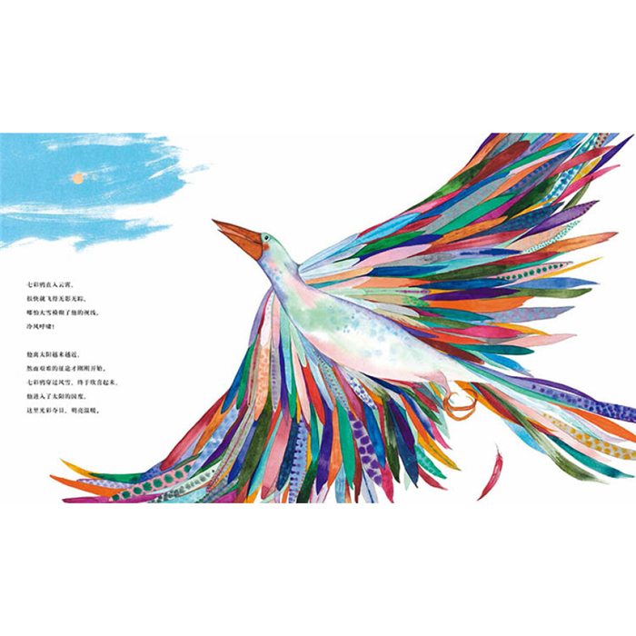 源自北美印第安人的民间故事。故事讲述了大地被严寒覆盖,七彩鸦飞去太阳那里取来了火种,拯救了万物生灵,自己却被太阳灼伤,彩色的羽毛变成了黑色。因此而自卑的他却有了意外的收获。