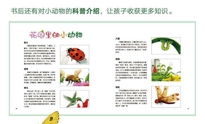 《热闹的花园》是一篇描写花园里繁忙的虫子、蜜蜂和鸟儿的抒情散文。全书色彩生动,第一页是花园的入口。随着书页的翻动,花园里会有越来越多的客人,一只蛹趁着人们不注意,在偷偷地发生着微妙的变化,直到书的最后,一只蝴蝶飞过花园边界。书的最后,讲述了这些花园来客们的自然演变史,完成了这些可爱的后院精灵的肖像描绘。一个花栗鼠隐藏在每一页上,以转移和吸引小读者的注意力。从文字上来看,第一页只有一句话,每过一页,就多加了一句话,花园里的客人越来越多,文字也就越来越多。文字读起来韵律感十足,朗朗上口。