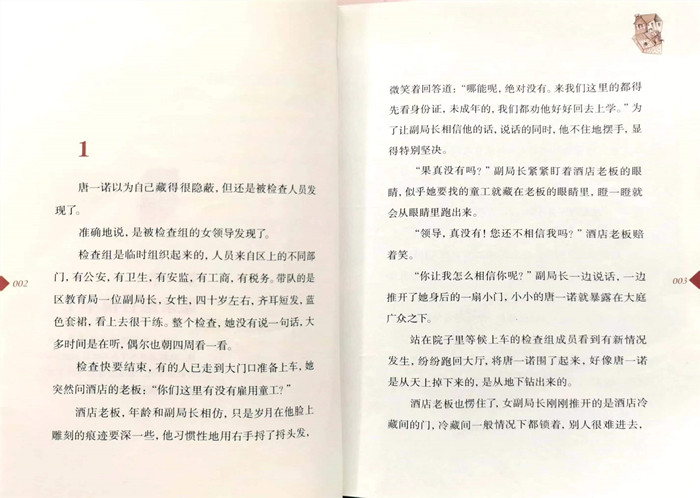 这是一部以家庭、家教、家风为主题的儿童小说。 寄居在城里的小学五年级学生唐一诺,为了交乒乓球特训班费用和贴补家用,和同学来到青青酒店想打一份小工,没想到突遇检查组,同学们四散逃窜,而他误入冷藏间,后被区教育局副局长发现……随着情节的展开,唐一诺和家人的故事被一层一层揭开,才知道他的善良、纯朴、热情、勤奋、通达等诸多美好品质都源于他的家庭教育,源于良好的家风。 作者以“大主张、小故事”的手法娓娓道来,精心构思的情节和布局,在看似平实的生活场景间安排了戏剧性的插曲,既有唐一诺妹妹的身世之谜,也有卜算者老爷爷的料事如神,还有搅局者周宇飞妈妈的横插一刀,使得全书波澜迭起,扣人心弦。 少年唐一诺和他的家人,在生活的磨难与风波里,诠释了家教与家风的传承。愿更多的少年儿童在优良家风的浸润下茁壮成长。