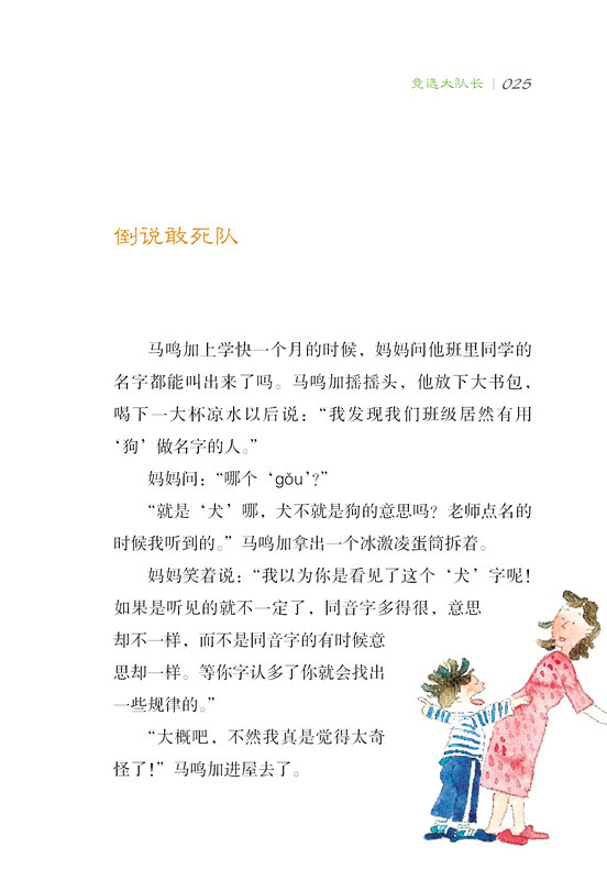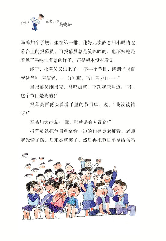 马鸣加看见站在黑板前的老师像个大姐姐,她让马鸣加坐在第二排的一个女孩子的旁边。马鸣加在坐下之前先朝后面看看,哇!后面还有那么多同学,不过他们看上去更像是二年级的。