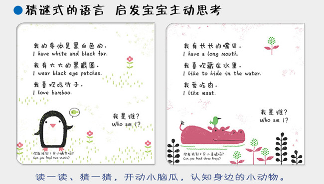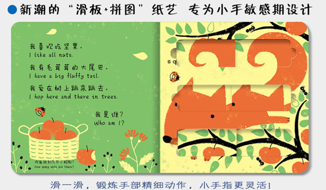 教育学家苏霍姆林斯基说过:“手是思想的镜子,是智力发展的刺激物。”由此可见手部发育的重要性,而1~4岁是宝宝手指精细动作发育的关键期,滑板书的特殊工艺可以让小手充分动起来,通过推、拉、滑锻炼小手指;另外,滑板的设计还给静态的图书增加了“动感”,画面动起来让阅读更有乐趣。《小小手指推拉滑板书》还在滑板的基础上加入了拼图的元素,宝宝不再是随意的推、拉、滑,还要开动小脑瓜拼一拼,拼出一个可爱的小动物;当然,猜谜式的语言、好玩的找寻游戏、地道的英语……也会让宝宝爱不释手。