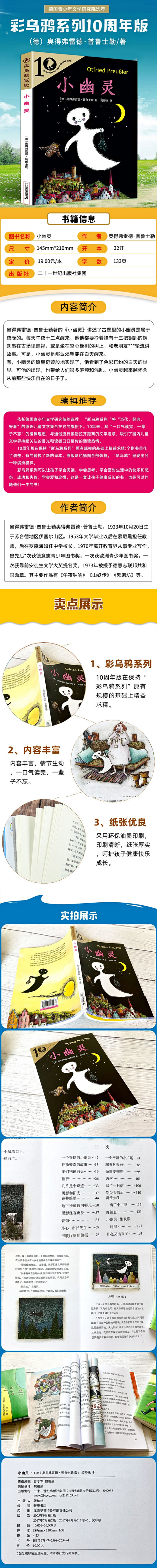 生活在古堡里的小幽灵是属于夜晚的,每天午夜十二点醒来后.他就拎着吊有十三把钥匙的钥匙串在古堡里巡视。或是坐在空心橡树的树权上,和他的老朋友猫头鹰轮流讲故事。可是,小幽灵是那么渴望能在白天醒来。有一天,他的愿望终于实现了……