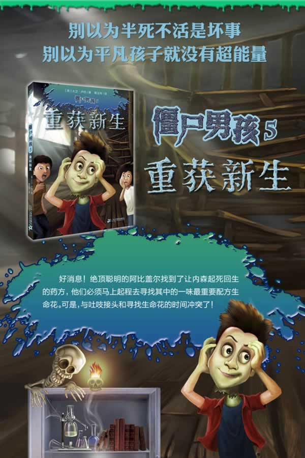 “僵尸男孩”系列,全套5册,以当下最流行的“僵尸”为切入点,将爆笑校园小说、冒险小说、惊悚小说等各种元素巧妙融为一炉,以普通五年级男孩内森的口吻讲述了他被误泼实验剂,变成了一个僵尸后发生的故事:一方面,他要应付变成僵尸男孩后,生活里层出不穷的各种麻烦;另一方面,他被一个特工组织BUM发掘,成为全世界独一无二的僵尸特工,不断完成各种艰巨任务,拯救世界。