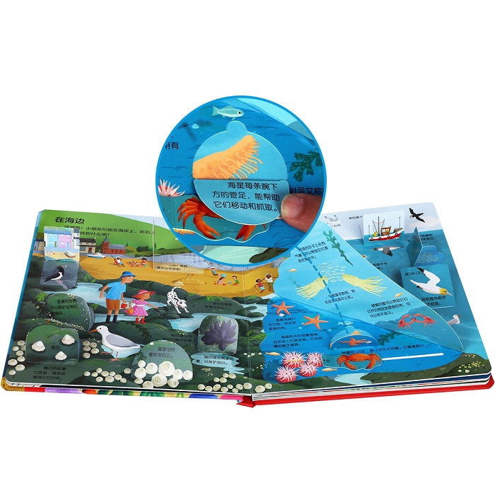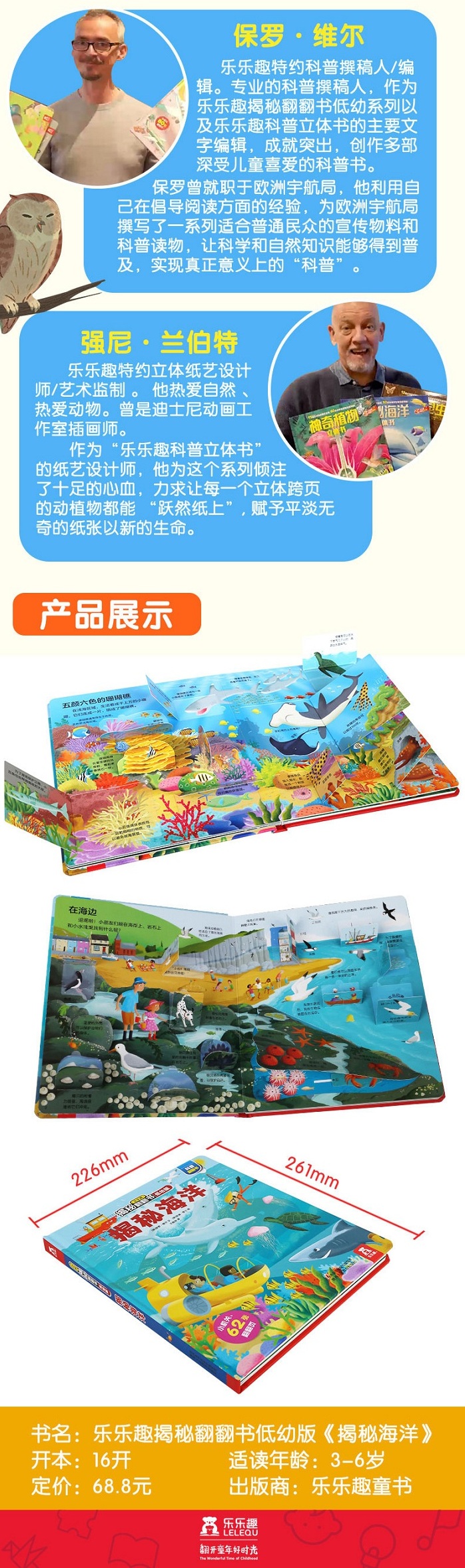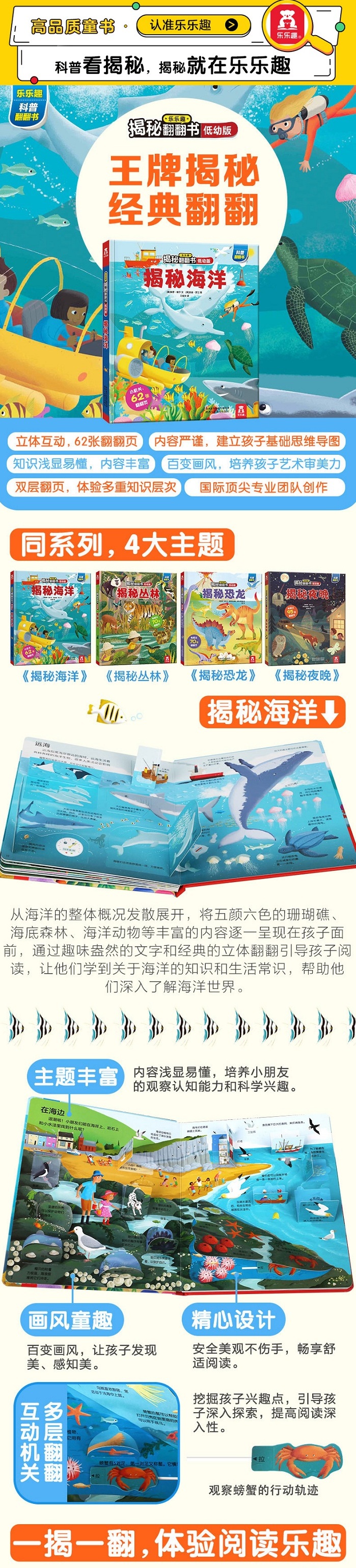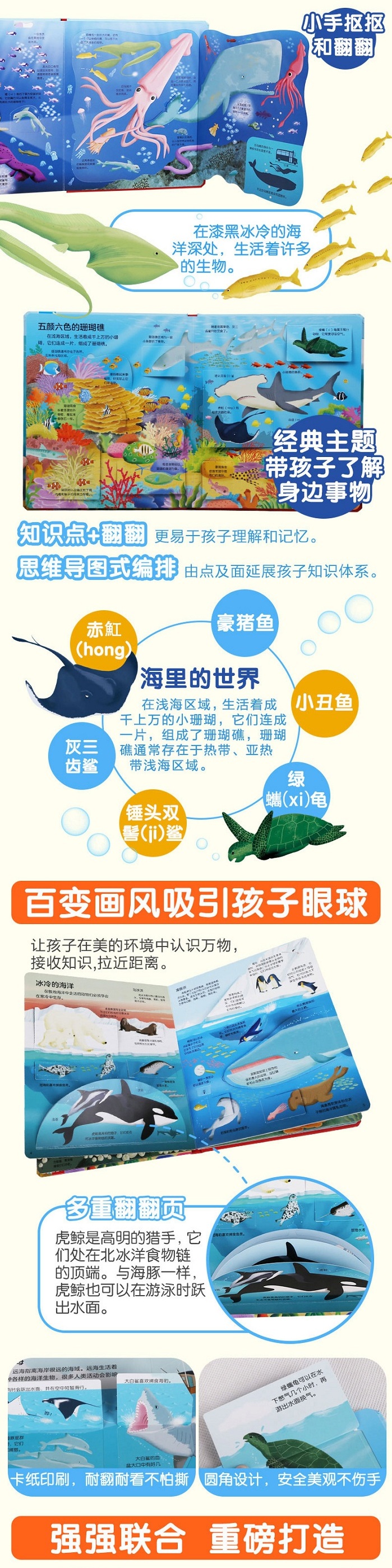 l 大折页、拉拉、转盘、62张翻翻页让小朋友在不断探索中掌握丰富的海洋知识;