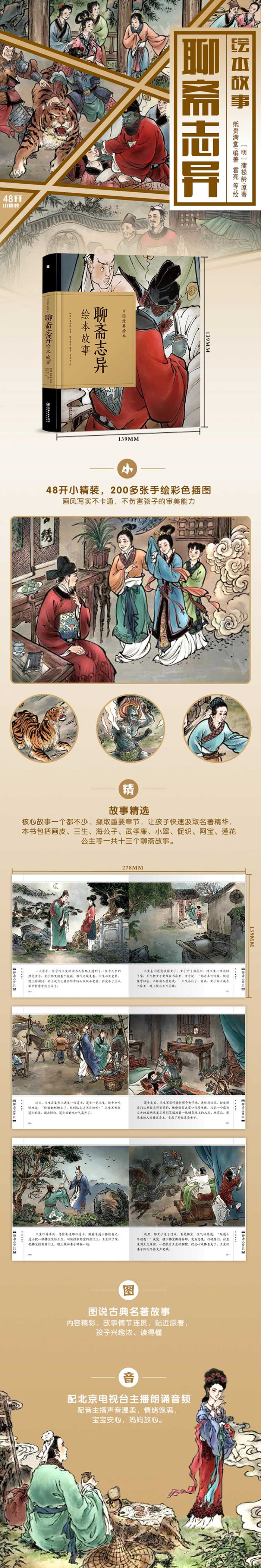 这是一套专为学龄前儿童和低年级的小学生打造的中国古典文学绘本,共17册。本套书精选经典的情节,采取连环画的形式重新演绎,以期通过这种图文呼应的阅读方式减轻孩子的阅读压力,帮助孩子们更直观地理解原著。? 《聊斋志异绘本》是一本专门写给学龄前儿童和低年级小学生阅读的绘本。《聊斋志异》简称《聊斋》,俗名《鬼狐传》,是清初的一部短篇小说集,共收录小说近五百篇,或写民间的民俗民习、奇谈异闻,或写世间万物的奇异变幻,题材广泛,是中国古代灵异与志怪小说的集大成者。本书分为画皮、聂小倩、陆判、促织4个篇章,精选10个家喻户晓的精彩故事,配上彩图予以场景还原,很适合儿童阅读。