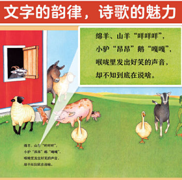 简简单单的童谣,充满节奏和韵律,意义循环而不重复,还生动模仿了各种动物的叫声。阿甲老师的译笔忠实而灵活地再现了原文神韵,读来朗朗上口。
