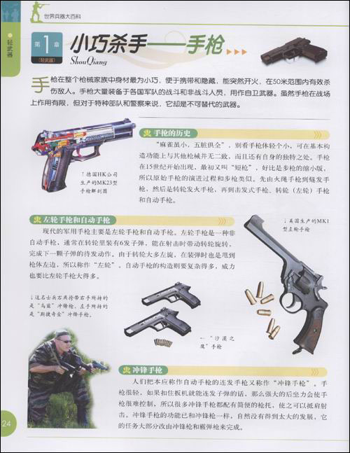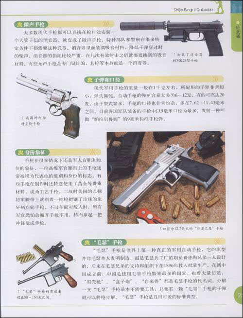 《世界兵器大百科》共分为了轻武器、火炮、坦克装甲车、军用飞机、军用舰艇、导弹、生化武器和核武器七章,几乎包括了现代主要军事强国所有的现役武器。为了让读者更好的理解,每一种武器都有属于自己的小秘密和小故事,引领读者走进一个阳刚的武器世界。传奇的枪炮,铁甲的坦克;翱翔的战机,威猛的军舰;100多种神秘的武器,600多幅精美的图片;近距离地体会,真实的武器世界。