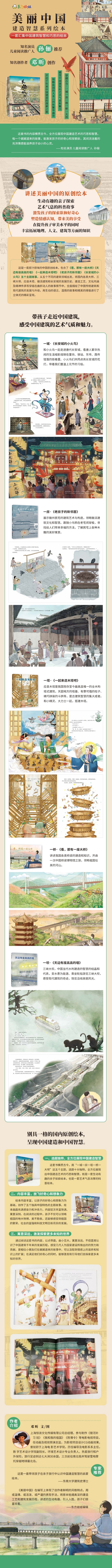 整套《美丽中国·建造智慧系列绘本》包含了五个独立的故事,从五个不同的建筑领域“一城一房一塔一桥一大坝”出发,用生动的语言、温情的故事立体呈现中国建造智慧。 《长安城的小火鸟》讲述中国唐代长安城的建造艺术。孩子跟着小火鸟走进唐代长安城。唐朝长安城是我国都城的典范,也为后世宋元明清时期的大型都城建设奠定了基础。阅读绘本,孩子了解我国都城建筑的城市布局、建造风格和居住功能等特点。 《老房子的新邻居》讲述徽派民居的建筑艺术和文化内涵。绘本展示中华民宅文化中的徽派建筑文化,了解其建筑空间的组成和主要构造。古厝包含了许多文化内涵,徽州木雕“物必饰图,图必有意”,寄托人们对美好生活的期许。 《一起来造木塔吧》讲述应县木塔建造艺术和智慧,科学性与想象力兼具。应县木塔是我国现存至今的、的全木构结塔型建筑,是古建筑智慧的集大成者。绘本抓住应县木塔的建造艺术和全木结构的建造技巧,同时融入富有童趣和想象力的故事情节。 《看,那有一座大桥》讲述我国各类桥梁的建造艺术和特点,带领孩子开启中国桥梁博物馆之旅。绘本展示各种桥梁,如梁式桥、拱式桥、钢构桥、斜拉桥等,以及桥梁工程师如何因地制宜,使天堑变通途。故事从东部广袤的丘陵平原走向西部的高原山地,一座座桥梁融于其中,领略祖国壮美山河。 《天边有座高高的墙》讲述三峡大坝建筑特点和作用。“我”和爸爸游三峡大坝,感受中国当代水利建造智慧。如何。三峡大坝利用上下游的185米的落差,改造大自然,而变水患为能源。