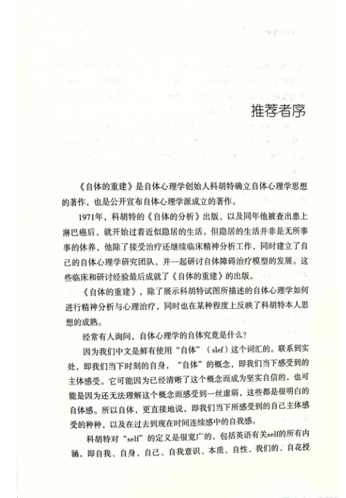 此书比起六年前的《自体的分析》,在心理世界毫无疑问造成更大的骚动。 科胡特在《自体的重建》这本书中,对《自体的分析》这本先驱之作中所提出的理论,不仅加以扩展,同时也加以澄清。在古典的精神分析传统中,专业地耕耘了一辈子之后,科胡特已经认知到古典分析理论的某些限制。如今他无畏地增加了一个新次元,以补古典理论的不足。