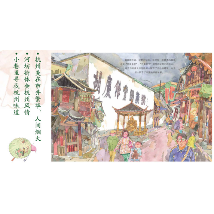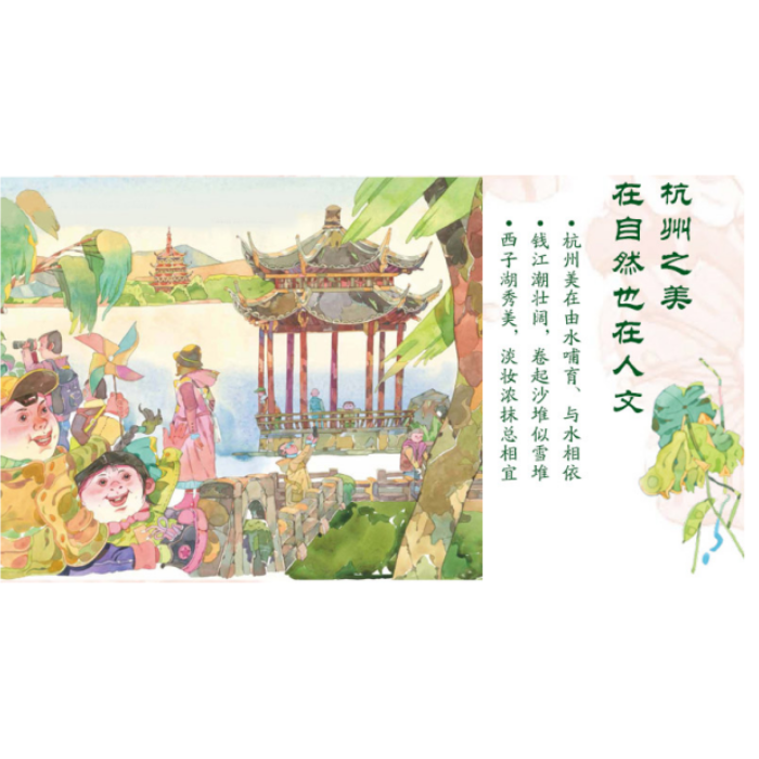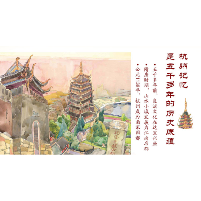 绘本用“杭州”为人称视角,展示了杭州5000多年的历史文化和当代的发展变化。在绘本里,良渚古城带我们认识了史前的杭州文明,西湖的变迁让我们浸润着历史的沧桑和华美;繁华的商业街遍布茶坊、酒肆、丝绸、香烛,纵时光流转也带不走杭州热闹的人间烟火和诗情画意。几千年岁月更迭,几千年沧海桑田。过去的杭州经历了盛世,经历了战争,经历的繁华,经历过苦难。“弄潮儿向涛头立,手把红旗旗不湿”,这些经历凝聚已成杭州独有的弄潮儿精神,将为杭州的未来继续开创新的篇章。