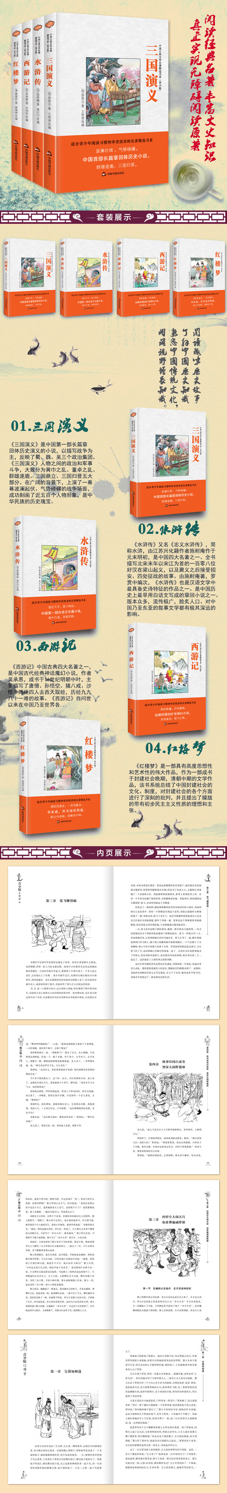 四大名著,又称为四大小说,为罗贯中写的《三国演义》、吴承恩写的《西游记》、施耐庵写的《水浒传》及曹雪芹写的《红楼梦》四部中国古典章回小说,是汉语文学中不可多得的作品。这四部著作历久不衰,其中的故事、场景,已经深深地影响了中国人的思想观念、价值取向。四部著作都有很高的艺术水平,细致的刻画和所蕴含的思想都为历代读者所称道。 在清朝的曹雪芹写作《红楼梦》以前,明代的李渔还有着“四大奇书”的这样一个说法,这"四大奇书"即为《三国演义》、《西游记》、《水浒传》、《金瓶梅》。但在曹雪芹的《红楼梦》成书后,《红楼梦》就取代了《金瓶梅》的位置,"四大奇书"也改称为“四大名著”。
