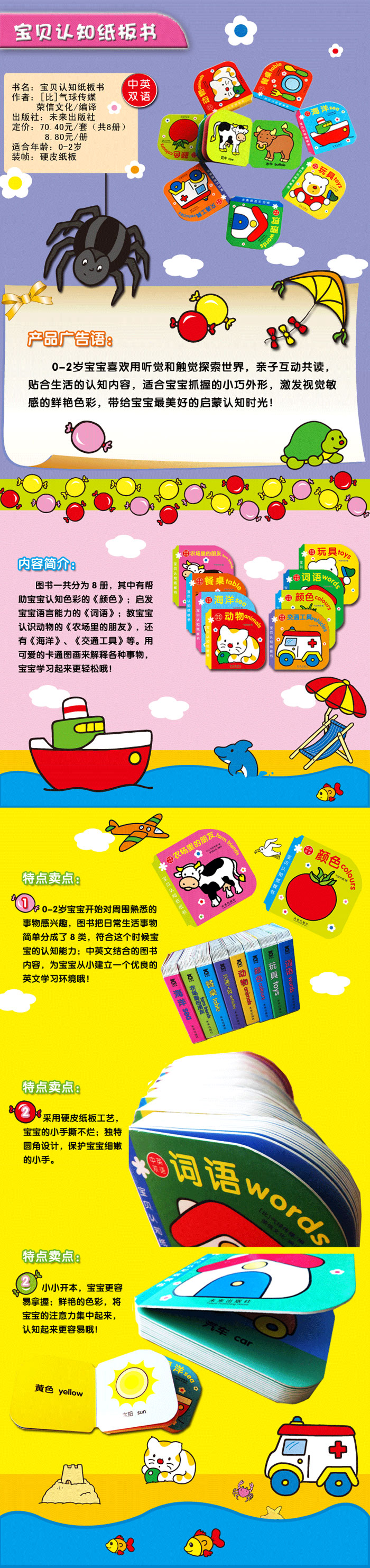 这套书在内容上用丰富的色彩结合可爱形象的图画,加上中英双语的对照结合形式,让宝宝在感官刺激的作用下,加深对物品的印象,从而更好的发展他的语言能力。在制作上本书采用硬皮纸板工艺,使它耐得住宝宝的小手撕扯,和小嘴的撕咬,而在书角设计方面采用了圆形书角设计,更好的保障了宝宝阅读时的安全。