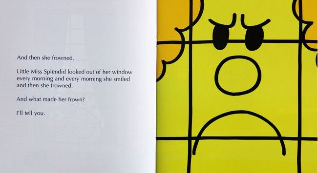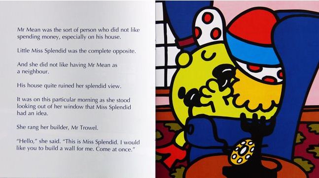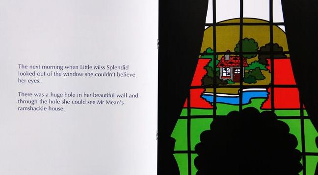 Little Miss Splendid住在一个大大的房子里,有着大大的花园还有很好的景色。但是,每天早上她总是一下笑一下皱眉头,为什么呢?因为隔着一条小河,住在他正对面的是Mr. Mean 破破烂烂的房子,Little Miss Splendid完全不能忍受她华丽的房子看出去竟然会有这种景象!所以他立刻打给工人,帮她盖一道墙,好挡住Mr. Mean破旧的房子。但对于Mr. Mean来说,他最满意他们家的地方就是每天早上都可以欣赏到Little Miss Splendid富丽堂皇的房子,所以当他看到这道墙时非常非常的生气,到底Mr.Mean会做出什么事情呢?