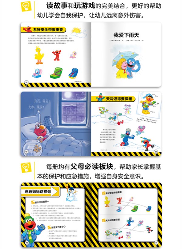《幼儿安全主题图画书》是一套专为3-6岁幼儿打造的安全常识主题教育图画书。全套共4册,涵盖了意外安全、运动安全、居家安全、交通安全、户外安全以及动物安全6个方面。通过讲述发生在芝麻街的生活故事,将与安全相关的各种场景生动地呈现出来。在故事中,芝麻街小伙伴们做出了良好的示范和榜样,故事后的安全情景重现以及亲子互动游戏可以帮助幼儿巩固和拓展必备的安全常识,学会自我保护。每册均加入了父母必读板块,旨在帮助家长增强自身的安全意识、掌握基本的保护和应急措施,为幼儿的安全成长保驾护航。