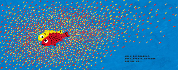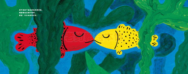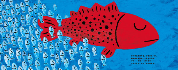 蒲蒲兰畅销绘本《彩虹色的花》的作者——麦克·格雷涅茨的最新力作。画风与其他作品风格迥异,故事依然充满温情。作品大胆地大量使用红黄蓝三原色,画面清爽、鲜艳,明亮,极富魅力。大开本的设计使画面更加丰满,尤其是小红鱼和小黄鱼被一大群孩子围绕着的画面,更加有张力而动人心弦。别致的护封上镂空出一条小鱼的形状,一旦打开护封——哇,强烈的视觉冲击一定会让小朋友爱不释手、目不转睛。这是一个以爱为主题的故事,也是一个以家庭温暖为主题的故事。菲儿原本是一条孤零零的小红鱼,除了讲故事给其他小鱼听,总是藏在水草里自己享受安静和孤独。和小黄鱼相遇后,彼此感受到了爱的两条小鱼一起甜甜入梦乡的温暖,一时不见了小黄鱼,菲儿的伤心失望,特别是故事的最后,特别是每天和小黄鱼一起被那么那么多的小小鱼围绕着,每天晚上讲很多很多的故事给鱼宝宝听——那种爸爸妈妈和孩子环绕一起的幸福感和满足感,怎能不在爸爸妈妈和孩子们的内心荡起涟漪·也许有人会有些许疑惑:这样以爱情为主题的故事,能讲给孩子听吗·为何不可呢·著名儿童文学学者季颖评价著名的绘本《黑兔和白兔》时曾说过——人生不能没有爱。爱是本能的,却又是需要培养的。干净、纯洁、真挚而美好的爱,无论是孩子还是大人,都能感受到喜悦和温暖。在这一点上,这本绘本与《黑兔和白兔》有异曲同工之妙。更重要的,这本书不仅仅表达了爱情的美好,而定格在家庭温暖的主题上。因为繁忙的工作或者其他各种各样的原因,爸爸妈妈们是否忽略了孩子期盼的眼神,很少和孩子一起全家其乐融融地共同度过闲暇时光呢·请爸爸妈妈一起拿起这本书坐在孩子身边,向小红鱼菲儿一样讲故事给孩子听吧。幸福就在这样的生活片段中。孩子小的时候,请在他心中种下爱和幸福的种子吧,小小的种子一定会在不久的将来,开出美丽的花。