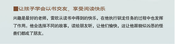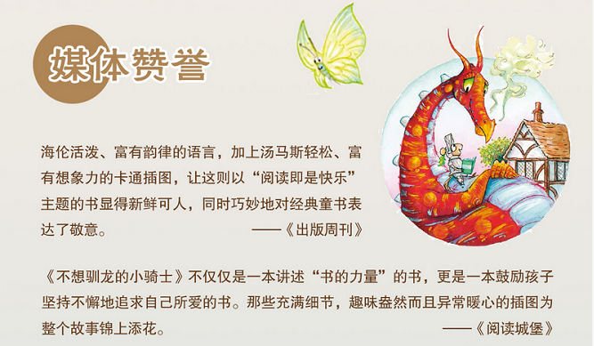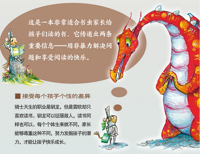 这是一本帮助孩子爱上阅读的书。小骑士雷欧(其实是一只小老鼠——注意尾巴)喜欢读书,但是他的爸爸妈妈为了锻炼他,偏偏让他出门去打怪兽,好成为一个真正的骑士。当雷欧面对这个世界上最可怕的怪兽们时,他很快发现,原来它们和任何人一样,可以为一本书深深入迷…… 睡前故事是每一个小朋友成长过程中所必需的“营养品”,它不仅是孩子们开始认识世界的窗户,更是传递父母与孩子之间感情的桥梁。这本英国著名夫妻档图画书作家创作的睡前故事书,可以充当爸妈的“哄娃神器”,让孩子像书中的“喷火龙”一样,安安静静听故事,乖乖地进入梦乡,并在潜移默化中懂得“故事的力量”。