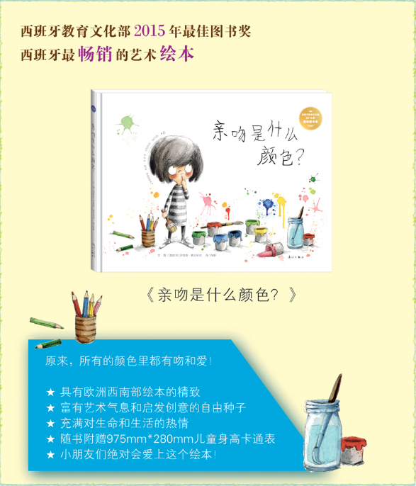 罗西奥·博尼利亚的这本《亲吻是什么颜色(精)》将颜色和亲吻相结合,将亲吻赋予了颜色的情感,能帮助孩子们发展辨别力、欣赏力、美的感受力,以及想象力、绘画能力。