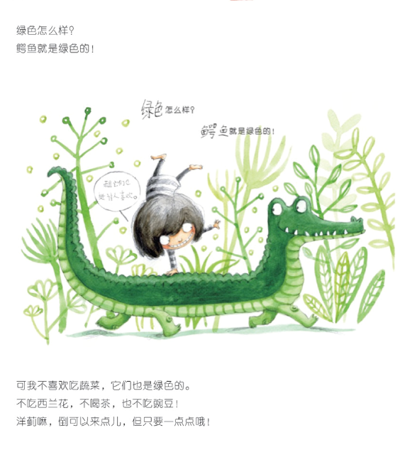 这个甜蜜温馨的故事提出了一个简单的问题:亲吻是什么颜色?活泼漂亮、勇于尝试的莫妮卡喜欢用各种色彩描绘她看见的世界。但这个问题把她难住了。亲吻是热情红,还是生气红?是讨喜的鳄鱼绿,还是偏食不爱吃的花椰菜绿?是美丽的向日葵黄、蜂蜜般甜的黄,还是蛰伤人的蜜蜂黄?是如白色月亮皎洁,还是像雪人的冰冻?每一种颜色都有小茉莉喜欢的地方和不喜欢的地方。她苦恼极了。但最后妈妈给了小茉莉一个吻,她才终于发现:原来,所有的颜色里都有吻和爱。