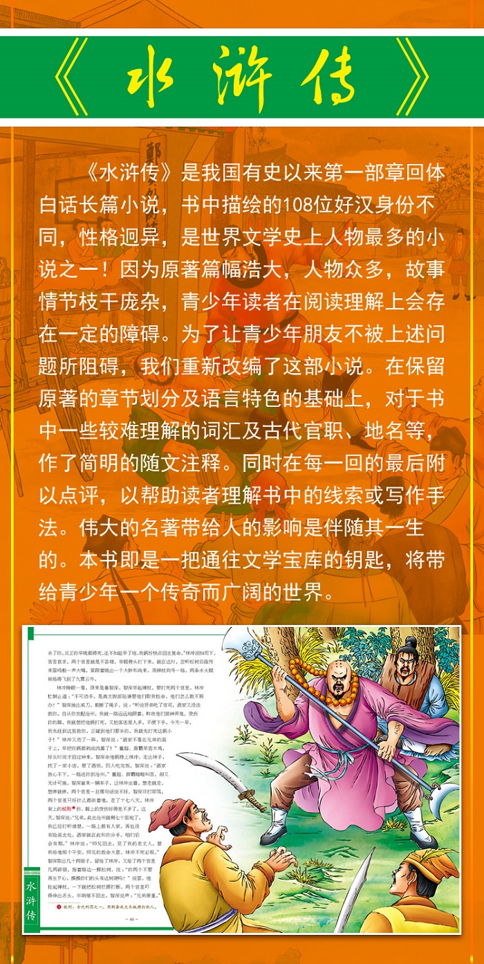 水浒传这本书的艺术成就非常高,自成书以来,流传极广,不断被改编成评书、戏剧、影视剧等。其中的许多故事,如武松打虎、林冲雪夜上梁山、杨志卖刀等,早已是家喻户晓。但因为原著篇幅浩大,人物众多,故事情节枝干庞杂,且在古代官职、地名等的运用上有虚构又失史实,青少年读者在阅读理解上会存在一定的障碍。而其中因历史局限对鬼神的描写及过于血腥的战争场面,不适合尚处于成长中的青少年读者阅读。加之在多年的流传过程中,因后人的传抄、补充、修改,形成了多个版本,不仅是青少年,成年读者都会产生困扰。为了让青少年朋友不被上述问题所阻碍,我们特地根据他们的心理特点和阅读习惯,重新改编了这部小说。改编版以通行的一百二十回本为蓝本,在保留原著的章节划分,保持生动活泼、充满生活气息的语言特色的基础上,对众多英雄人物和枝干情节进行了梳理,使得改编后的内容更为精练,文字更加流畅简明。对于书中一些较难理解,但删改后会影响到内容表达的词汇及古代官职、地名等条目,作了简明的随文注释。同时在每一回的最后附以点评,以帮助读者理解书中的线索或写作手法