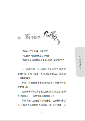 妈妈将梯子架在阁楼人口,喊道:“下来!”我顺着梯子往下爬.刚落地.就感到耳朵一阵火辣辣的痛——妈妈正用力揪我的耳朵。她骂道:“杨歌.你胆子越来越大了呀!我让你在家好好做作业.你却爬到阁楼上去玩耍!你把我的话当耳旁风了吗?……”妈妈骂起人来像机关枪扫射似的.把我的耳朵震得生疼。我忙求饶,连声说着:“妈妈,我以后再也不敢了!”妈妈放开我的耳朵,又对在她另一只手手心里的爸爸说道:“杨歌他爸,你这个‘教育部长’怎么当的?不看着他做作业就算了,竟然和他一起爬阁楼!说,你们到阁楼上去干什么?”爸爸说:“我们到阁楼上去……” 我忙打断他的话:“去灭鼠!阁楼上的老鼠太嚣张了.跑来跑去,吵得我做不了作业。”我可不能让妈妈知道我去阁楼是为了“探险”,不然她非把我和爸爸赶出家门,到外面“探险”不可!妈妈满腹狐疑地看着爸爸,问道:“是这样吗?”爸爸点点头。妈妈说:“哼,杨歌,你不要完不成作业怪老鼠!这都是因为你的心不静。过去有一位伟人,为了锻炼定力.故意到闹市上去看书! ”我知道妈妈说的这位伟人就是毛泽东! 妈妈说:“好了,瞧你一身灰尘,脏死了,先去洗个澡再做作业吧!”妈妈看了看刚刚砸到她的那本书,皱着眉头说:“这是什么破书?尽是鬼画符!这么厚,把它卖给收破烂的李三,应该多少能卖点钱吧?”妈妈搬着梯子走了,顺手带走了那本厚厚的书。